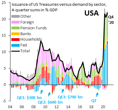 La creación de $120.000 millones de dólares fake cada mes para comprar deuda ($80.000 del Tesoro y $40.000 de agencias o corporativa) cumple ese cometido, manipular para evitar subastas de deuda desiertas y caídas adicionales del precio, equivalentes a subidas de rentabilidad que serían letales para las cuentas de un Estado USA que ya debe más de $28 billones.