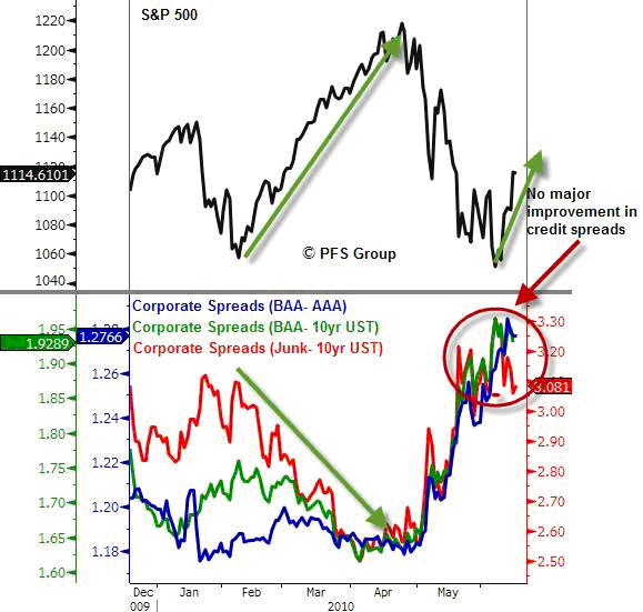Y a continuación, traigo unos gráficos comparados también de la evolución del mercado de acciones –SP500-, en esta ocasión con la de los diferenciales de deuda.