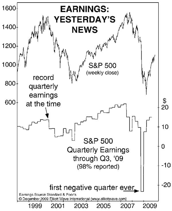 "Earnings per share for S&P 500 companies surged for six quarters in a row, during which time the S&P suffered its largest collapse for the entire period from 1938 to 2007, a 70-year span. Moreover, the S&P bottomed in early October 1974, and earnings-per-share then turned down for 12 straight months."