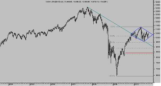 El Dow Jones presenta una pauta técnica interesante. Frente a la formación de h-c-h que algunos defienden, pienso más probable una formación de diamante, vean el rombo azul que aparece en la gráfica.