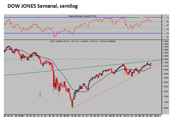 Mientras tanto, las bolsas han permanecido imperturbables. El gráfico siguiente refleja la falta de dirección o movimiento lateral del Dow iniciado pocas sesiones antes de las elecciones legislativas y de la confirmación del programa QE-2.