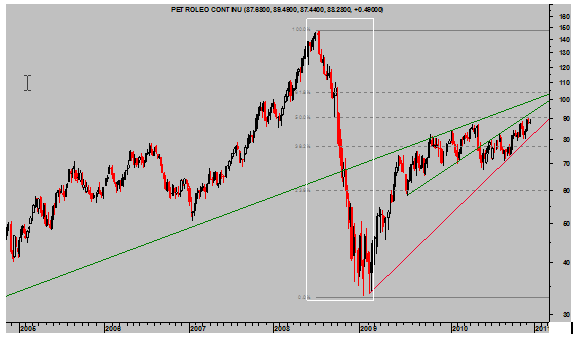 Lo interesante es GS sugiriendo comprar Oro, estima una revalorización superior al 20% durante 2.011. Mucha atención a esto por si acaso!. Hay un antecedente serio a considerar. En verano del año 2.008 cuando el crudo cotizaba en $135 por barril, Goldman recomendaba comprar agresivamente argumentando todo tipo de razones para explicar que el precio iba encaminado a los $200. A los pocos días observen lo que ocurrió: