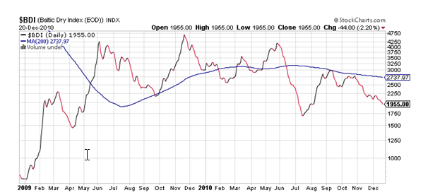 El Índice Baltic se encuentra en el mismo nivel que en febrero de 2009 y analizado desde una perspectiva estrictamente técnica se advierte que presenta una situación débil, cotizando claramente por debajo de su media móvil de 200 sesiones, habiendo desplegado un patrón de máximos y mínimos decrecientes desde los máximos de noviembre de 2.009 y se dirige a hacer un test de los mínimos registrados el pasado mes de julio.