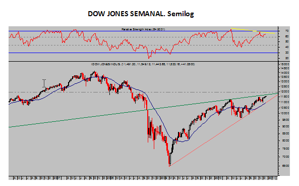 Por fin el Dow Jones cerró claramente sobre los 10450 puntos y está progresando al alza lentamente y sin decisión. El primer objetivo alcista dista cerca del 1% desde los precios de cierre de ayer –trazo verde con origen en el año 1.937- y posibilidad -baja- de extensión del movimiento hacia el número redondo y resistencia horizontal de gráfico 12.000.