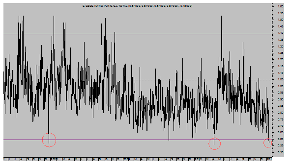 En ambas ocasiones, pocas sesiones de contratación después de que el ratio Put / Call perdiera la cota del 0.60, los mercados medidos por el SP500 cayeron del orden del 10% y 15% respectivamente en cuestión de semanas.