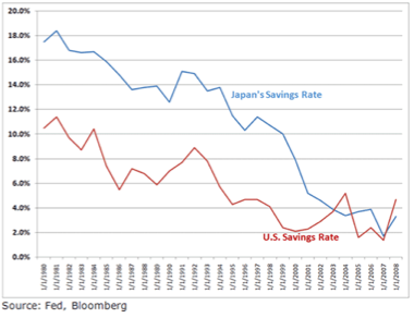 El consumidor, japonés y americano, ha gastado buena parte de sus reservas como podemos ver en el cuadro de arriba en el momento menos oportuno, cuando afronta un futuro económico tortuoso, con dificultad para encontrar empleo, salarios contenidos y precios de alimentos y energía desbocados (en sólo 6 meses el maíz ha subido un 82%, trigo 85%, azúcar 125%, algodón 125%....CRB index 44%).