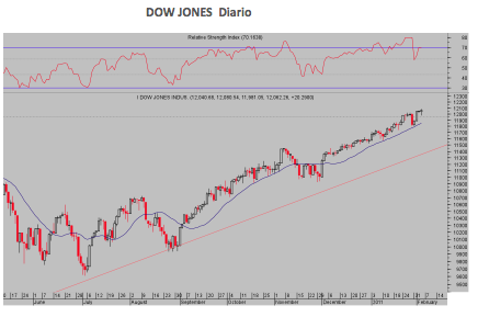El índice Dow de Industriales prosigue su camino alcista respetando perfectamente su media móvil de corto plazo, la estructura de máximos y mínimos crecientes a pesar de su acusada sobrecompra y numerosas divergencias técnicas.