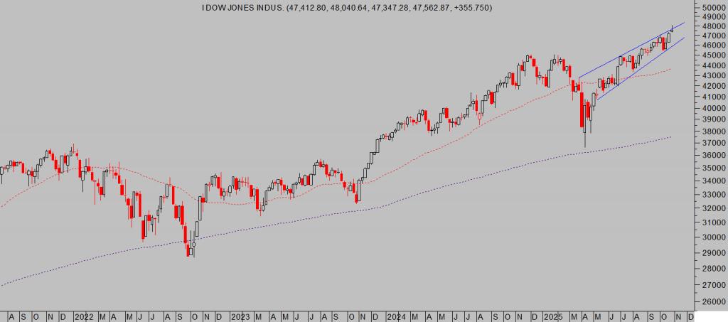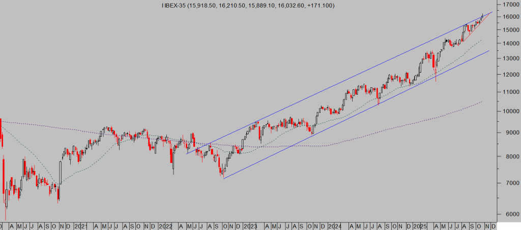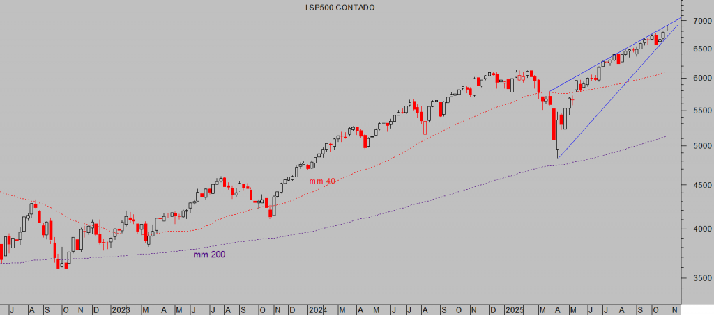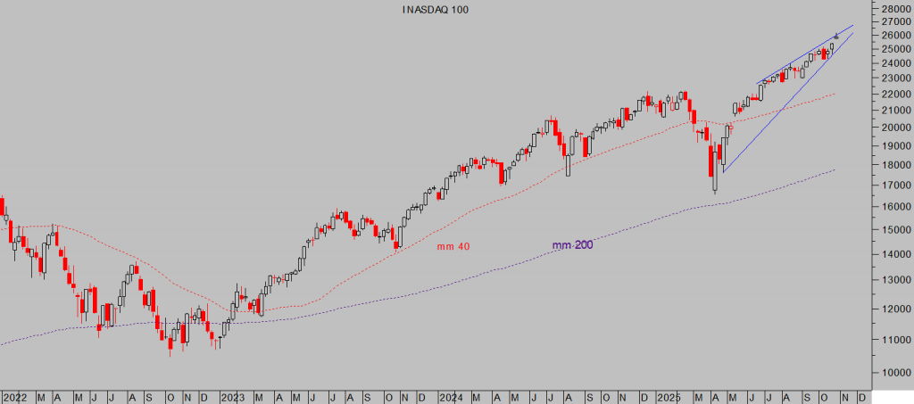 Las subidas se centran en pocos valores, responsables de la mayoría de la rentabilidad obtenida por los índices en los últimos años (hasta un 75% de las ganancias del SP500 en los últimos meses han sido proporcionadas exclusivamente por la tecnología orientada a IA), mientras que muchas acciones no acompañan ni confirman la fortaleza que se presupone a un mercado que ha subido más de un 50% en sólo 6 meses el Nasdaq o de un 40% el SP500.