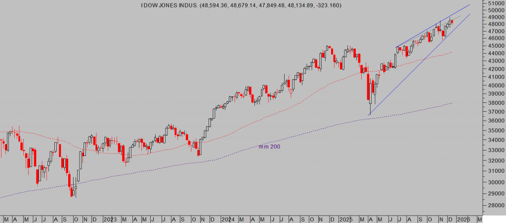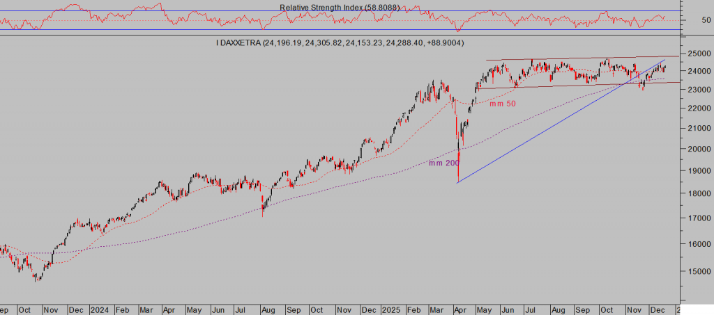 Veremos en el gráfico del DAX más abajo que comenzó este año con fuerza, después corrigió en marzo- abril y recuperó agresivamente en abril-mayo. Desde entonces ha desplegado un movimiento lateral,~8 meses, con posibilidades de ser resuelto pronto y de acuerdo con escenarios de comportamiento explicados aquí ¿Por qué 2026 será volátil y clave para las bolsas?.