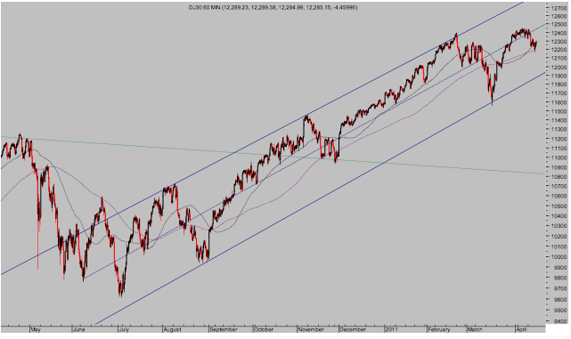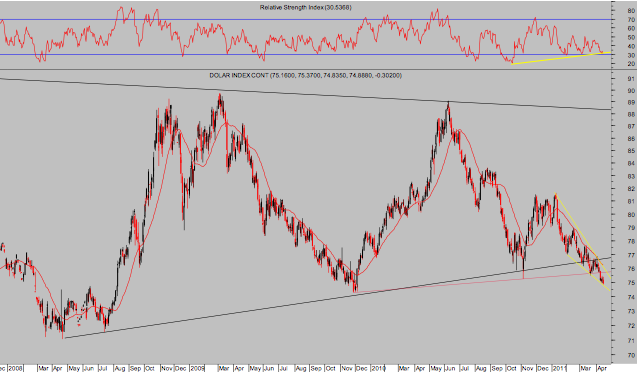 La cercanía de mayo aconseja cautela por la costumbre estacional de debilidad del mercado. Junio y el fin, o no, del QE2 está también se acerca. Las divergencias que están surgiendo tras los descensos de febrero-marzo son considerables y no sólo en diarios, también en semanales… pero la consigna de la FED está clara y además, el dólar continúa cayendo y apoyando al mercado de acciones. A pesar de lo cual, podemos ir a máximos, yes we can, pero mucho ojo!