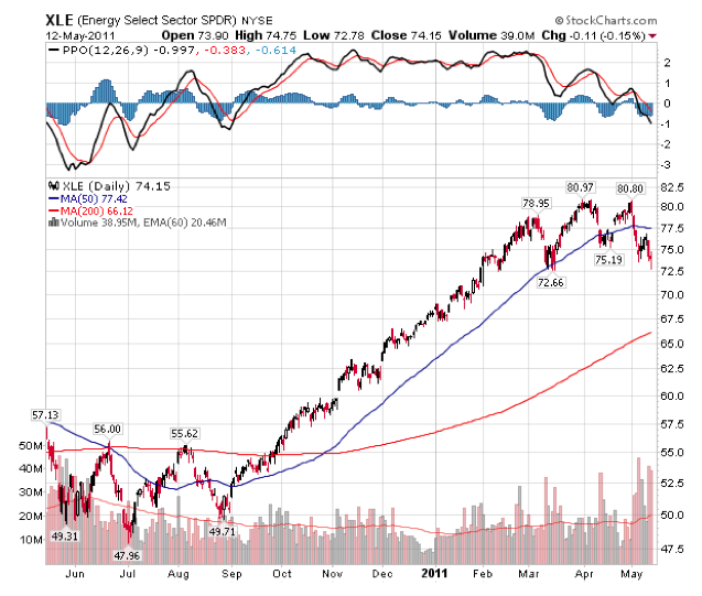 Aproximadamente el 42% de los beneficios del SP500 del primer trimestre fueron aportación exclusiva del sector energía. Cuando la ponderación de un solo sector es tan elevada conviene prestar atención minuciosa al sector en cuestión, suele ser síntoma que anticipa debilidad y que se confirma con el giro en la tendencia del propio sector.