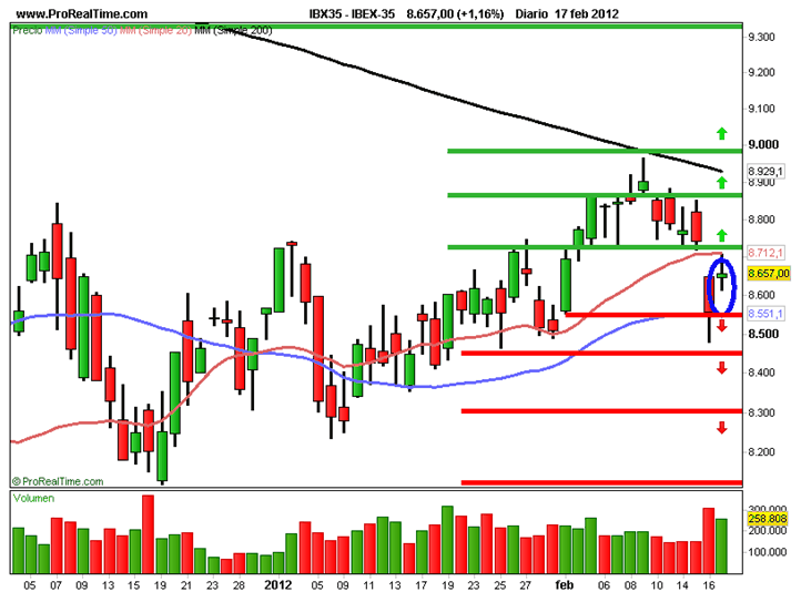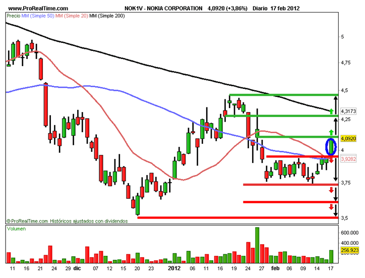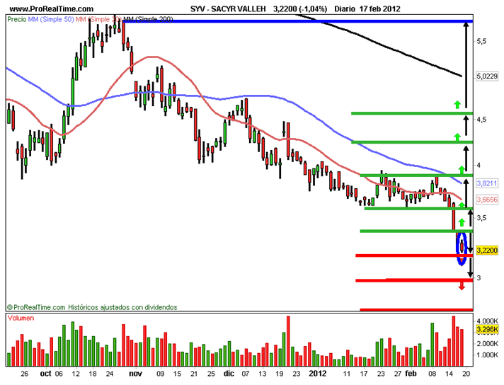En gráfico semanal la tendencia es bajista. Hizo máximos en el 2007 donde formo un techo en los 51,75 euros para luego desplomarse estrepitosamente hasta los 3,20 euros con una caída de un 93% y de momento está respetando esta zona. En gráfico diario la tendencia es bajista y se está apoyando en el soporte de los 3,24 euros que ya lo utilizo en agosto del 2010. Las medias móviles de 20-50 y 200 sesiones están por encima del precio confirmando la tendencia del valor. No debe de perder este soporte. La vela de hoy al cierre es una peonza que igual que las anteriores refleja la debilidad de la tendencia. Este empate de fuerzas nos confirma el soporte.