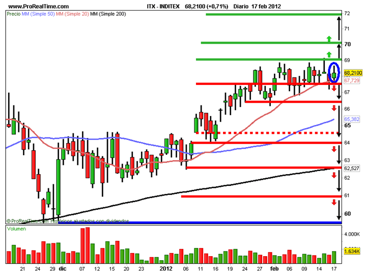 En gráfico semanal la tendencia es alcista. Se apoyo en los mínimos de los 22,30 donde formó un doble suelo y durante tres años ha ido subiendo haciendo mínimos y máximos ascendentes. Es una tendencia con mucha fuerza y está haciendo una figura de cuña ascendente que puede ser de continuación. En gráfico diario la tendencia es alcista y está en una zona de consolidación. Si rompe la resistencia que tiene en los 69,15 euros estará en subida libre. Por la parte de abajo, no debe de perder el soporte que tiene en los 66,40 euros. El volumen es normal. El viernes formó una peonza que nos indica debilidad ya que la fuerza tanto de alcistas como bajistas está igualada. La pauta nos indica y confirma la zona de consolidación.