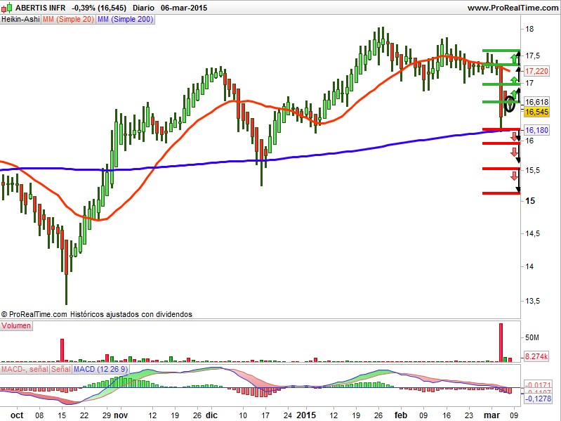 En el gráfico semanal de velas japonesas la tendencia de largo plazo es alcista. Este valor en el año 2000 hizo mínimos en los 2,72 euros formando un suelo que le sirvió de soporte mayor y en el año 2001 empezó a subir con mucha fuerza imparable consiguiendo una revalorización de un 577% hasta el año 2015, es decir, una rentabilidad espectacular. En el gráfico diario la tendencia es alcista y en octubre del 2014 formó una figura chartista de giro alcista que tiene el nombre de figura en uve, la cual cumplió su cometido. De momento el valor se ha encontrado con una resistencia en los 18,045 euros que ha parado la subida y ha formado dos techos. El valor ha corregido esta semana, abriendo con un gap a la baja importante y se ha parado en la media de 200 sesiones. Si nos fijamos se ha apoyado en una pauta de vela que tiene el nombre de martillo, la cual ha confirmado el soporte. La media de 20 sesiones actúa de resistencia, el volumen ha disminuido y el indicador MACD está neutral. La vela del viernes al cierre es una peonza, que en la zona que ha salido no nos dice nada, debemos esperar. En el análisis de vela Heikin Ashi la vela del viernes al cierre es una vela pequeña que nos confirma el soporte, debemos esperar.