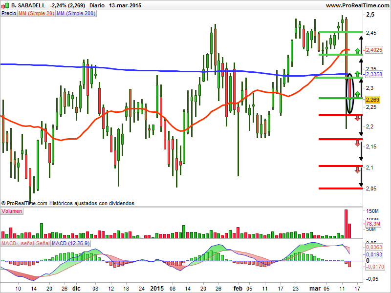 En el gráfico semanal de velas japonesas la tendencia de largo plazo es bajista y la tendencia de corto plazo es alcista. En el año 2007 formó un techo en los 6,01 que definió una resistencia que no pudo superar y el valor empezó a caer en picado hasta encontrar un soporte en los 1,10 euros con una corrección de un 82,17% hasta formar dos suelos que detuvieron la caída del banco. A partir de aquí rebotó al alza pero encontró una resistencia en los 2,73 euros que detuvo la subida nuevamente. La tendencia de corto plazo es alcista y se apoyó en el soporte de los 1,19 euros donde formó una figura chartista de giro alcista de tasa y asa es, la cual cometió su labor ya que el valor estuvo subiendo con fuerza. Desde el año 2014 está en una zona de consolidación, las medias móviles de 20 y 200 sesiones actúan de resistencia, el volumen ha disminuido y el indicador MACD se está girando hacia abajo. La vela del viernes al cierre tiene el nombre de cuerpo real rojo Marubozu y es bajista. La pauta muestra como en la apertura el valor cayo y luego se recuperó al cierre pero los bajistas ganaron la sesión, debemos esperar. En el análisis de velas Heikin Ashi la vela del viernes al cierre es una vela grande roja bajista, la cual nos confirma el soporte y debemos esperar.