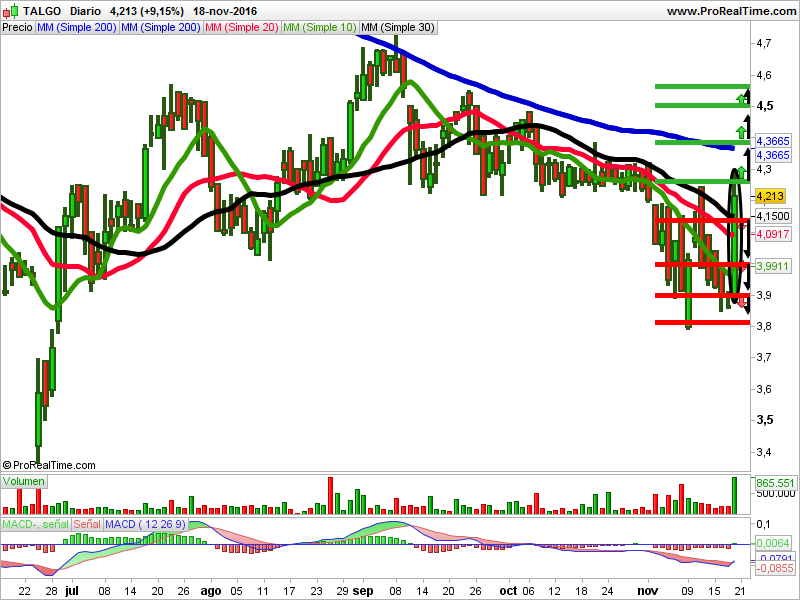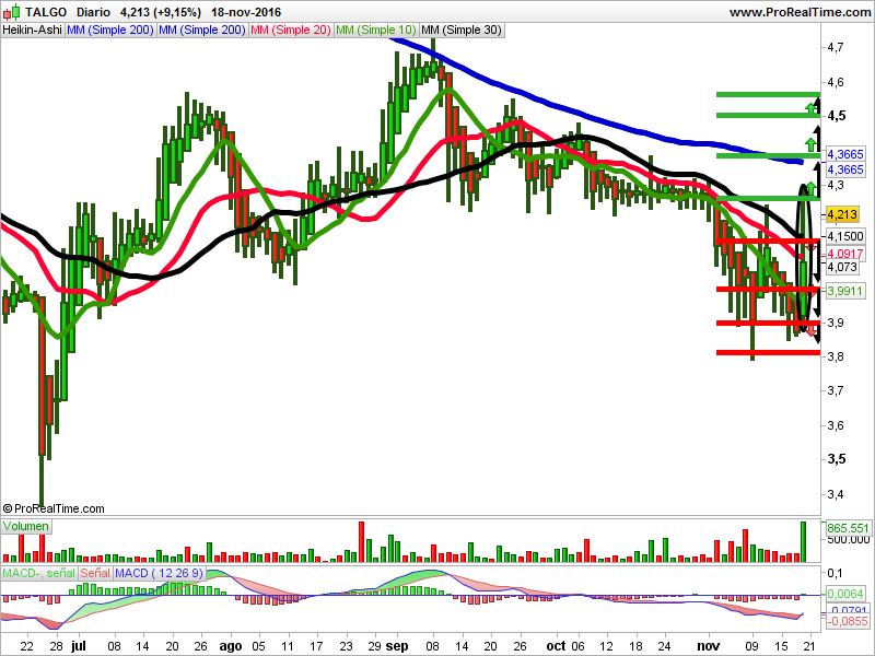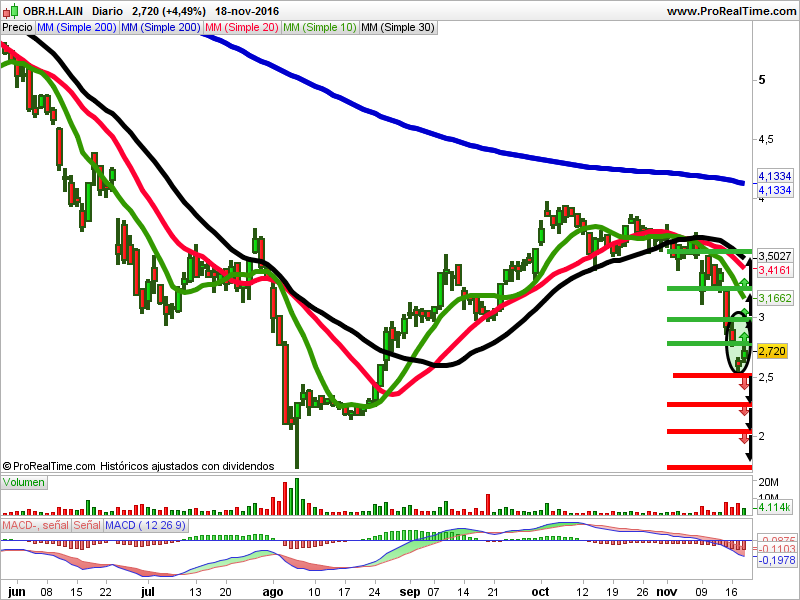Las medias de 10, 20 y 30 actúan de resistencias. La de 200, de soporte. El volumen ha aumentado. El macd está en sobreventa. La vela del viernes al cierre es un cuerpo real grande bajista a la apertura. Confirma el soporte. Debemos esperar.