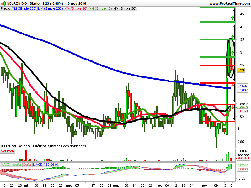 - Estrategias alcistas: La señal se activará al romper la resistencia de 1,28 euros. Protegemos con un stop en 1,23 euros y buscaría un 5,08% de objetivo hasta la resistencia de 1,35 euros. Al romperla, el próximo objetivo sería de 5,00% y stop en 1,31 euros.