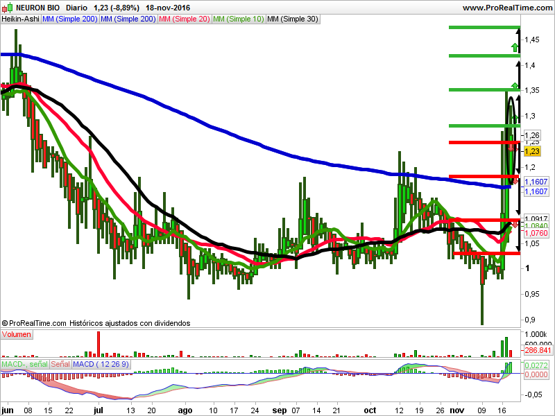 - Estrategias bajistas: La señal se activará al romper el soporte de 1,25 euros. Protegemos con un stop en 1,30 euros y buscaría un 5,05% de objetivo hasta el soporte de 1,18 euros. Al romperlo, el próximo objetivo sería de 6,72% y stop en 1,23 euros.