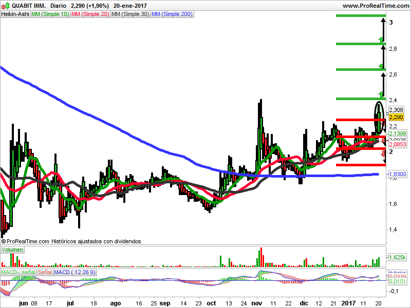 En el gráfico semanal de velas japonesas, la tendencia es bajista. En marzo del 2015 hizo máximos en los 6,19 euros. En este punto, formó una pauta envolvente bajista y corrigió hasta los 1,36 euros. Se ha devaluado un 78,73%. Durante el 2016, ha estado en zona lateral. En gráfico diario la tendencia es bajista. Dentro de la zona de consolidación, se ha roto la resistencia de los 2,25 euros, pero sin fuerza.