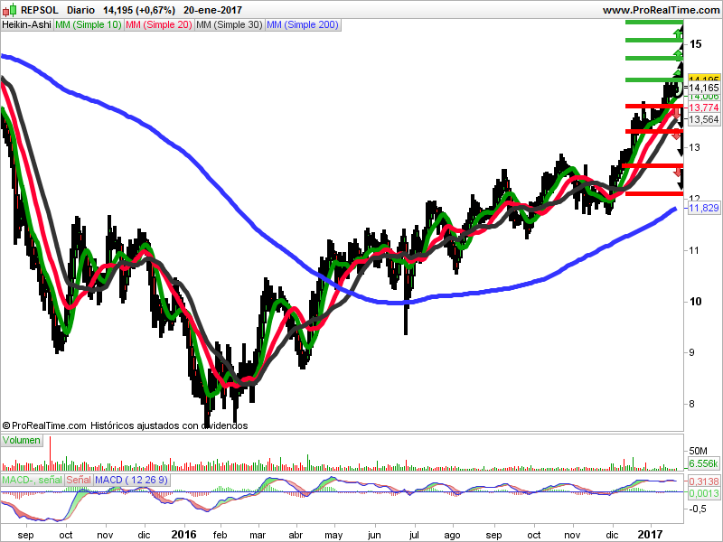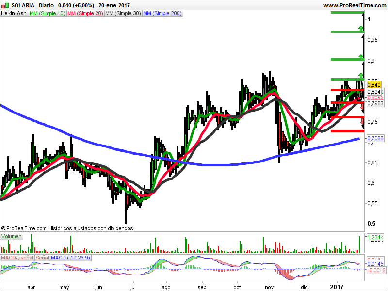 Las medias de 10, 20, 30 y 200 actúan de soporte. El volumen acompaña al valor. El macd está en sobrecompra. La vela del viernes al cierre es una peonza. Confirma la zona de consolidación y debemos esperar.