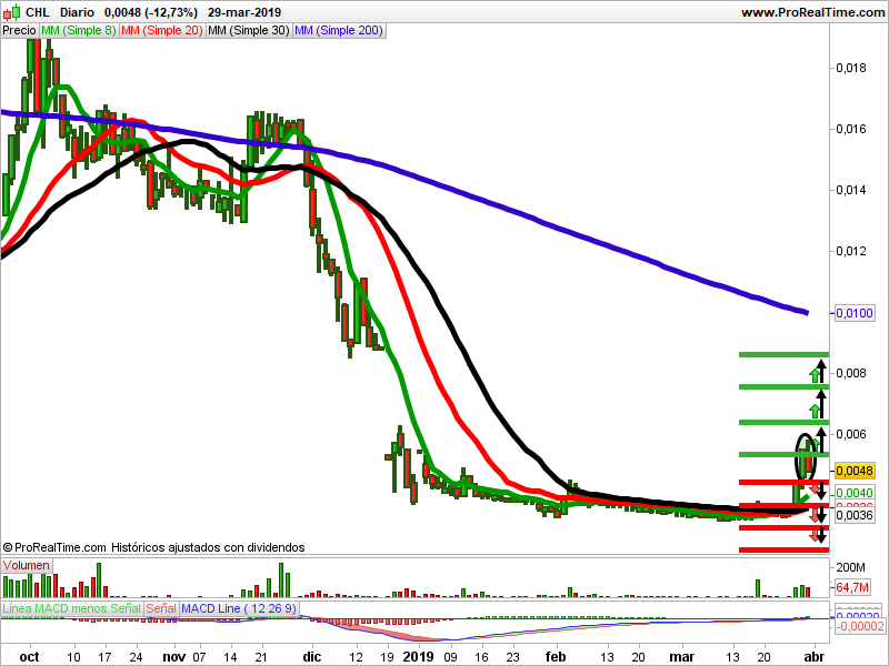 En el gráfico semanal de velas japonesas, la tendencia es bajista. En 2017, hizo máximos en los 0,5510 euros que le ha servido de resistencia. No la ha podido superar y ha corregido un 93,85%. Durante este último año se ha estado moviendo en una zona de consolidación. En gráfico diario lleva tres meses en zona lateral. El jueves rompió la resistencia de los 0,0045 euros.
