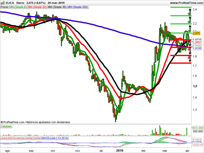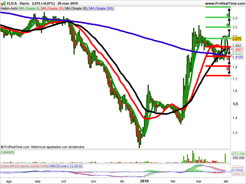 En el gráfico semanal de velas japonesas, la tendencia es alcista. En septiembre del 2017 hizo máximos en los 2,97 euros que le ha servido de resistencia. Ha estado durante un año en zona lateral. El valor ha corregido un 59,20% y se ha apoyado en los 1,20 euros, que está utilizando de soporte. En gráfico diario se confirma este soporte con un doji. En febrero empezó a subir, pero ha encontrado una resistencia importante en los 2,22 euros. Durante este mes de marzo ha estado consolidando.