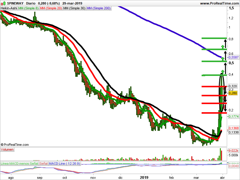 Las medias de 8, 20 y 30 actúan de soporte. La de 200, de resistencia. El volumen ha disminuido. El macd está alcista. La vela del viernes al cierre es bajista. Debemos estar atentos a los puntos de entrada indicados.