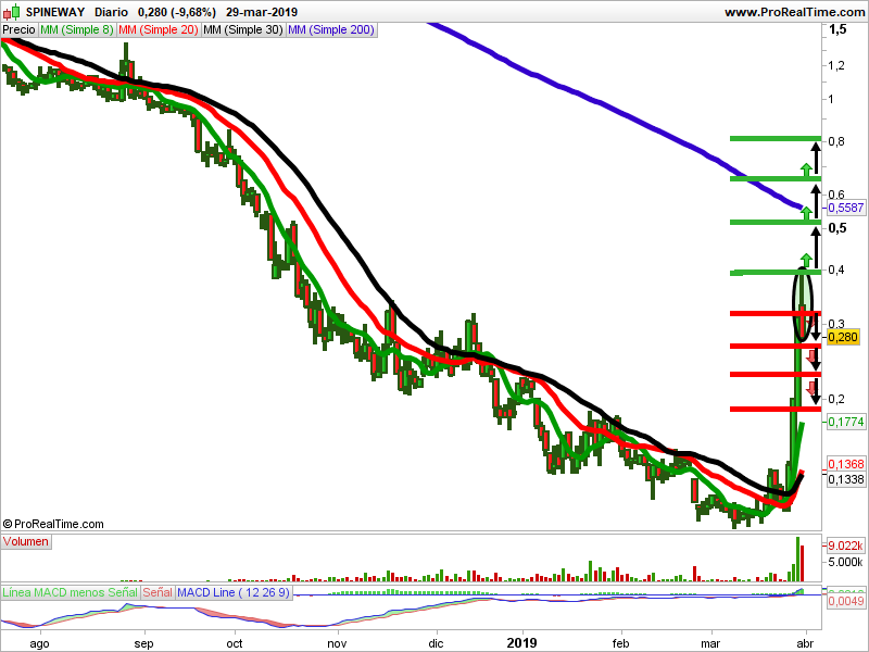 En el gráfico semanal de velas japonesas, la tendencia es bajista. Durante 2017 estuvo en máximos. En febrero de 2018 empezó a caer con fuerza y ha corregido un 97,26%. Se ha apoyado en los 0,100 euros que, de momento, actúa de soporte. En gráfico diario, esta semana rompió la resistencia de los 0,131 euros. La rotura se ha hecho a través de tres soldados alcistas. Ha estado entrando mucho dinero.