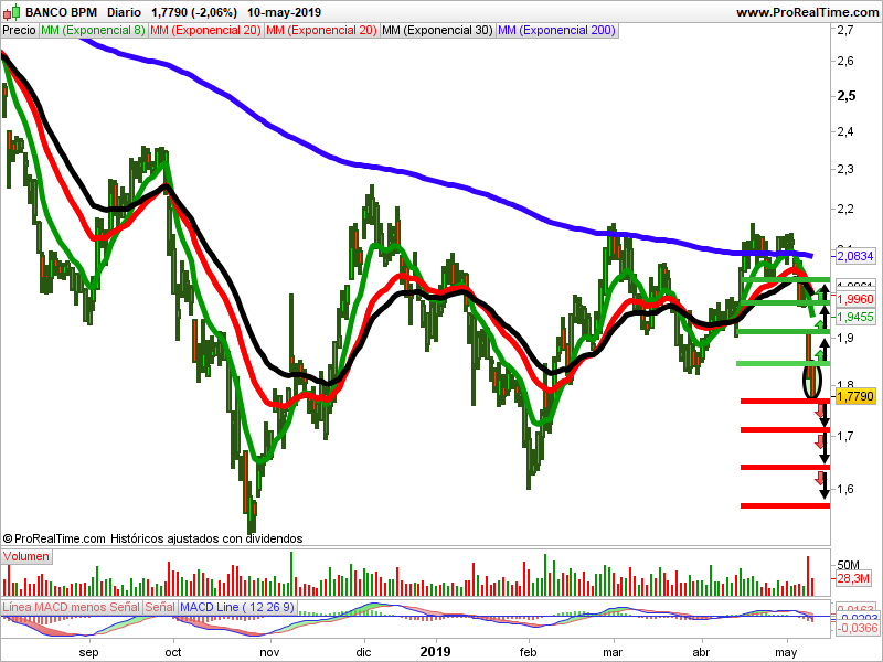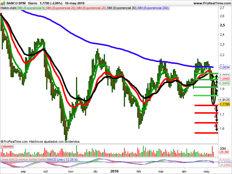 Las medias móviles de 8, 20, 30 y 200 actúan de resistencia. El volumen acompaña al valor. El indicador macd es bajista. La vela del viernes al cierre es un marubozu bajista al cierre. Ha salido papel. Debemos prestar atención a los puntos de entrada indicados.