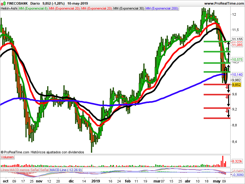 - Estrategias bajistas: La señal se activará al romper el soporte de 9,856 euros. Protegemos con un stop en 10,075 euros y buscaría un 2,66% de objetivo hasta el soporte de 9,580 euros. Al romperlo, el próximo objetivo sería de 3,37% y stop en 9,826 euros.