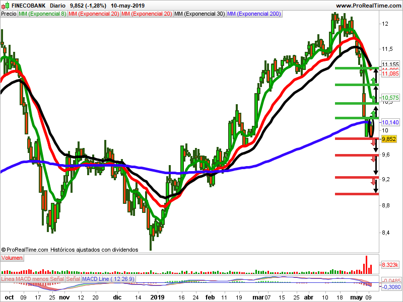 Las medias móviles de 8, 20, 30 y 200 confirman la tendencia bajista. El volumen ha aumentado. El macd está neutral. La vela del viernes al cierre es un cuerpo grande y bajista. Ha salido mucho papel. Debemos prestar atención a los puntos de entrada indicados.