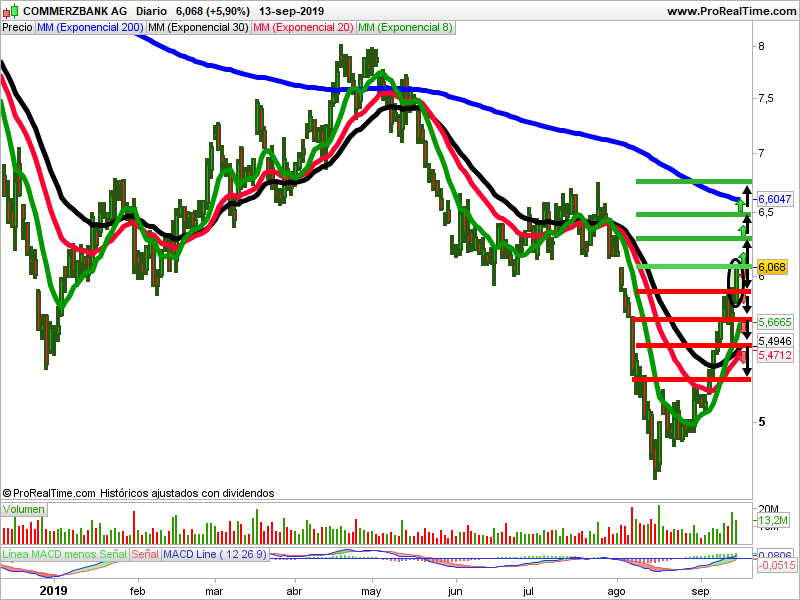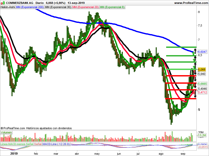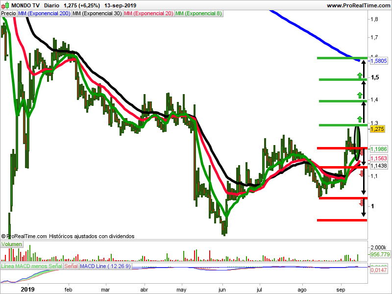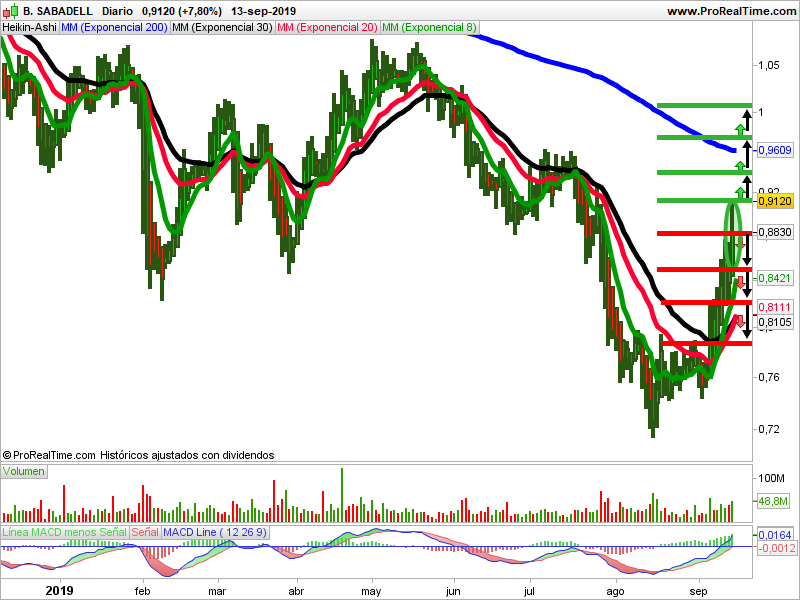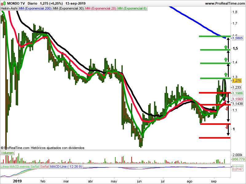 Las medias móviles de 8, 20 y 30 actúan de soporte. La de 200, de resistencia. El volumen acompaña al valor. El macd está neutral. La vela del viernes al cierre es un marubozu alcista. Ha entrado dinero. Debemos prestar atención a los puntos de entrada indicados.