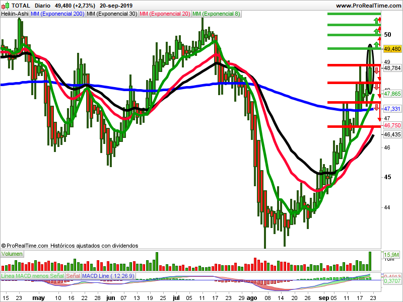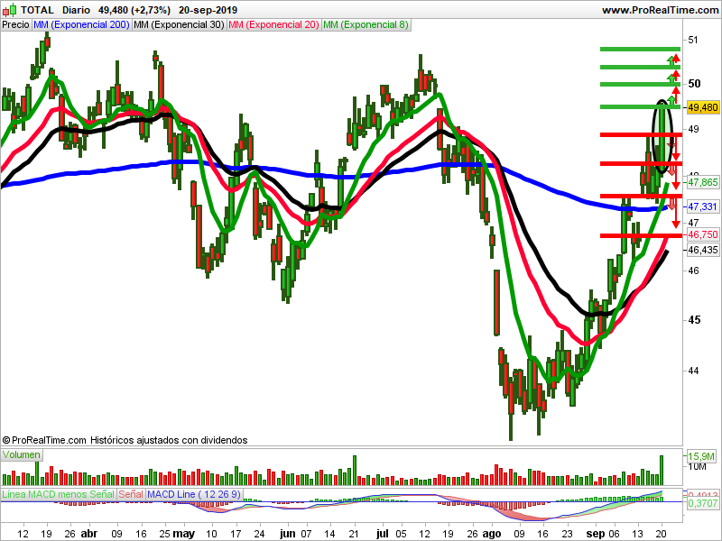 - Estrategias alcistas: La señal se activará al romper la resistencia de 49,53 euros. Protegemos con un stop en 49,120 euros y buscaría un 0,88% de objetivo hasta la resistencia de 50,01 euros. Al romperla, el próximo objetivo sería de 0,62% y stop en 49,595 euros.