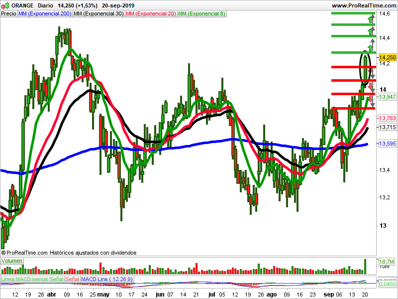 - Estrategias alcistas: La señal se activará al romper la resistencia de 14,295 euros. Protegemos con un stop en 14,185 euros y buscaría un 0,77% de objetivo hasta la resistencia de 14,420 euros. Al romperla, el próximo objetivo sería de 0,66% y stop en 14,335 euros.
