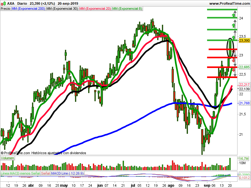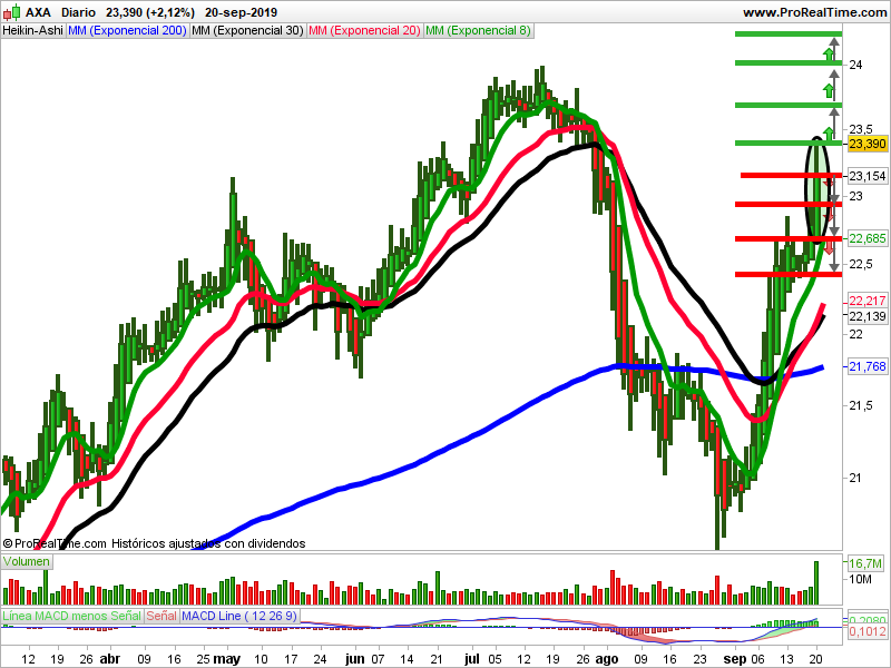Las medias móviles de 8, 20, 30 y 200 actúan de soporte. El volumen ha aumentado. El macd está en sobrecompra. La vela del viernes al cierre es un grande y alcista. Ha entrado dinero. Debemos prestar atención a los puntos de entrada indicados.