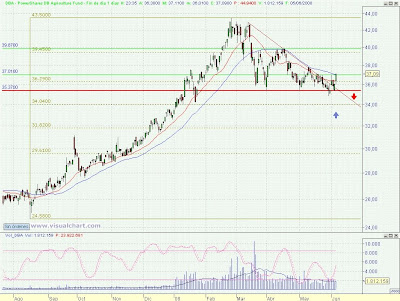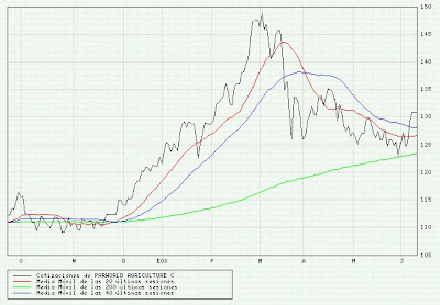 Vemos varias opciones para incorporarnos a la gran subida que han tenido los productos agrícolas, maíz, trigo, soja, azúcar, .... O de tomar beneficios si se rompen los mínimos de los últimos días, que nos alertarían de una corrección mayor.