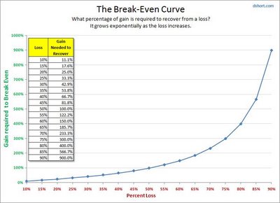 Es el gran problema para quien no ha movido su cartera, para el que piensa "ya se recuperara", "yo voy a largo plazo", etc... Para recuperar una caída del -60 % hay que subir un +150%. Y para que su rentabilidad vuelva a ser positiva un +20% o un +50%, por ejemplo, tendremos que haber subido un 200% y un 275% respectivamente.