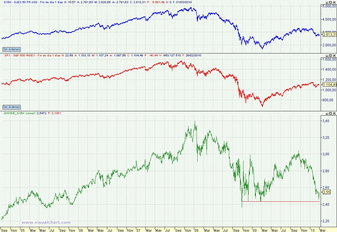 Podemos ver cláramente el distinto comportamiento que han tenido el Eurostoxx y el S&P 500: