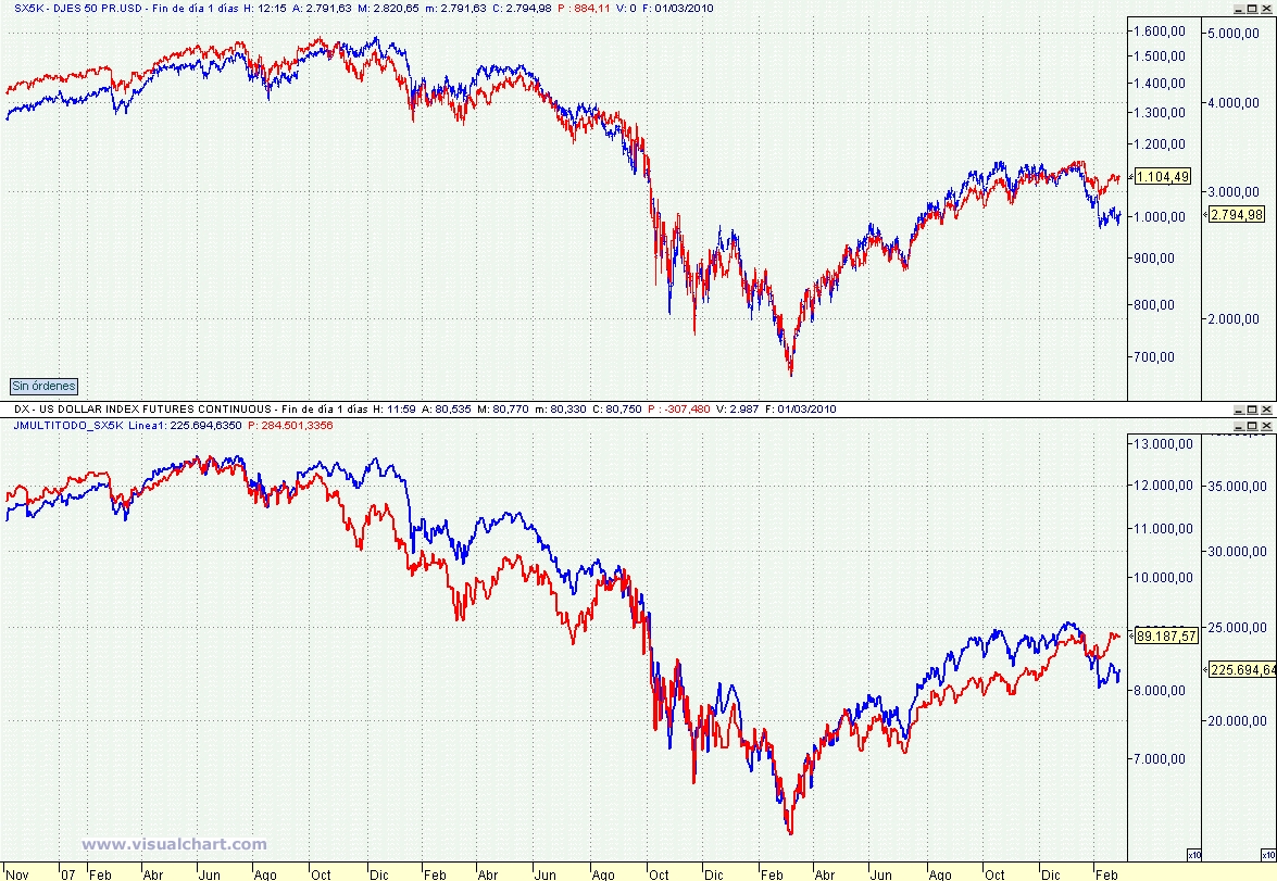 Eurostoxx y S&P 500 en moneda local y en Us Dollar Index