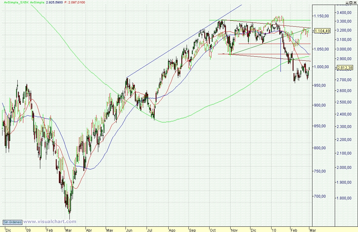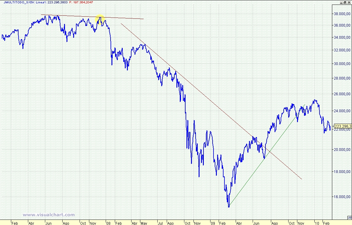 Se observan figuras de hombro cabeza hombro y divergencias, que se produce entre finales del 2007 y principios del 2008, con el índice en dólares, al igual que se dan en el Eurostoxx: