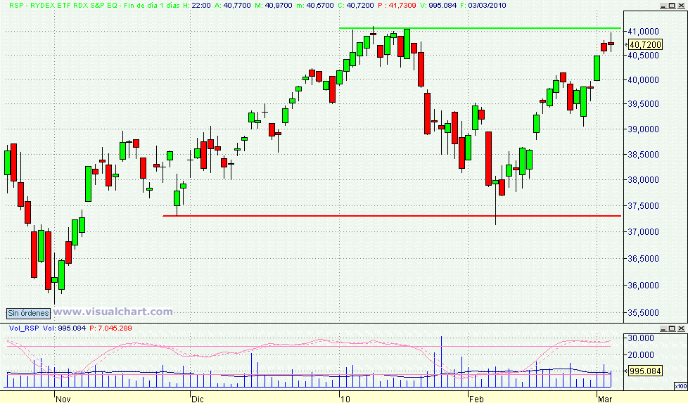 Al seguir este ETF (RSP) se consigue evitar que los movimientos del índice estén propiciados por unos pocos títulos que ponderen mucho. Ayer se acercó a máximos e hizo una vela 'preocupante'