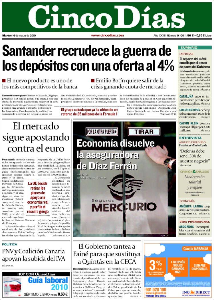 Ayer fue portada del Cinco Días: 'Santander recrudece la guerra de los depósitos con una oferta al 4%'.
