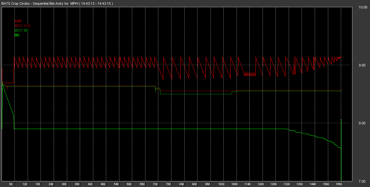 Kevin nos muestra los algoritmos "the knife", "the carnival" y "the Boston shuffler" descubiertos por la empresa Nanex y que si me permitís la licencia poética son como el agente Smith de Matrix, se están ejecutando dentro del sistema financiero día y noche. Lo siguiente es una imagen del efecto del algoritmo "the knife" en los mercados.