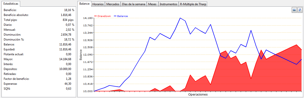 A continuación el mismo sistema pero con mi detector rudimentario de regímenes de Mercado NRK basado en redes neuronales que le indica al sistema cuándo tiene que operar y cuándo no. En realidad, técnicamente opera con el mínimo (0.01 lotes) cuando no es su momento y con 1 lote entero cuando la red determina que sí está en su momento (así me es más facil comparar todas las estadísticas).
