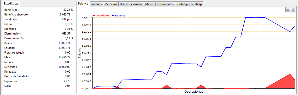 Las mismas operaciones de esta forma generan 3023€ de beneficio, con un respetable 3,80 como factor de beneficio y un 4,39 como relación entre el riesgo y beneficio. Lo remarco: hemos pasado de un ratio del 0,68 al 4,39. Fijaos en cómo ha evitado el drawdown en la parte final. Ahora sí merece la pena operar este sistema.