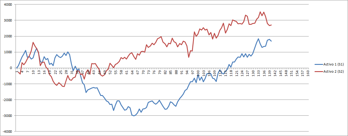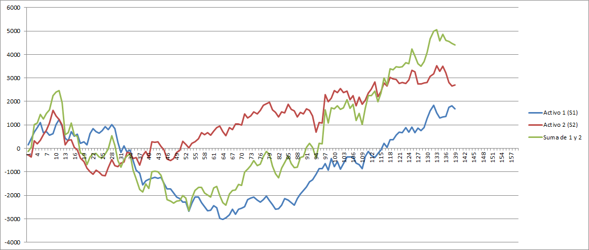 Lo siguiente es un ejemplo de uso de árboles de decisión para seleccionar entre dos activos o sistemas de trading, llamémoslos S1 y S2. El gráfico muestra los rendimientos mensuales (en puntos) de cada uno de los activos desde el año 2001 hasta primeros del 2014. El S1 consigue en este periodo 2700 puntos y el S2 consigue 1700.