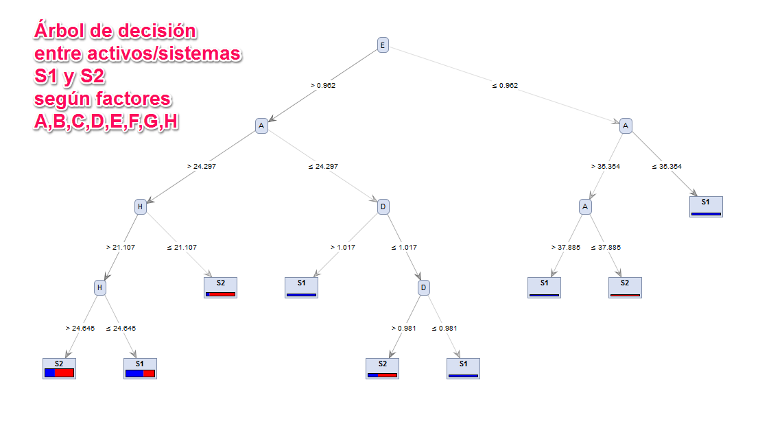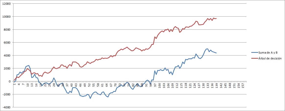 Como decía, los árboles de decisión nos sirven para conocer cuáles son y en qué medida influyen determinados factores en un resultado o decisión. Podríamos buscar los factores que influyen en los periodos en los que gana y pierde el sistema S1 y lo mismo para el S2, para a continuación seleccionar entre un sistema u otro cuando se den determinados factores.