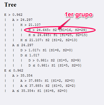 El árbol clasifica los resultados en función de los factores A, B, C, D, E, F, G y H. Por ejemplo para el nodo final S2 que hay a la izquierda del gráfico se entiende que: