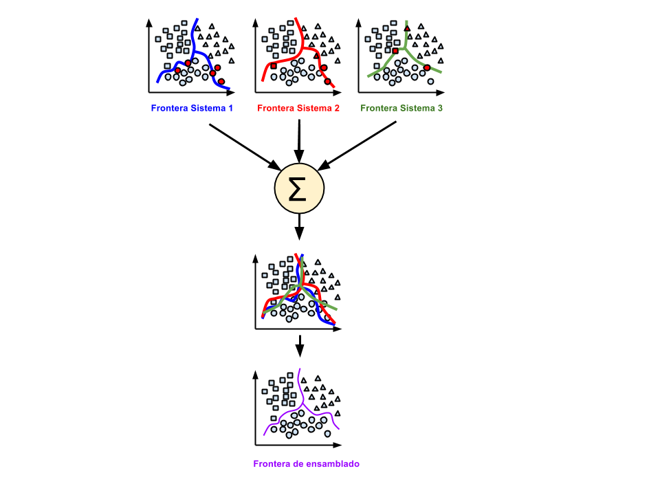 Cada uno de los robots tiene lo que se llama una “frontera de decisión” para elegir qué acción tomar, en la imagen vemos como cada uno de los robots elige correcta o incorrectamente la acción a tomar según dónde traza sus fronteras. Cada uno de los robots hace bien su trabajo, pero aun así comete algunos errores. Mediante el ensamblado se combinan las fronteras de decisión de los tres robots mejorando sustancialmente la capacidad de tomar decisiones correctas.