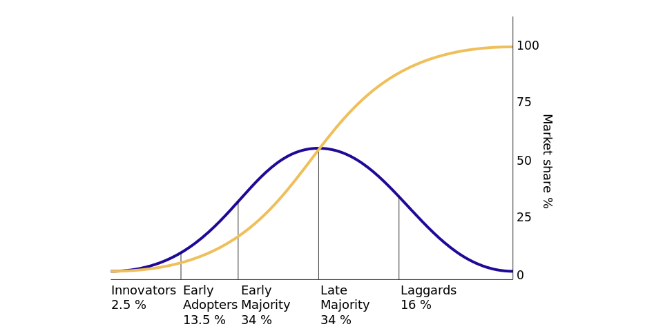 En el siguiente gráfico tenemos la conocida curva de adopción-difusión de la innovación de Rogers. La línea azul representa el crecimiento en número de usuarios de una determinada tecnología, siendo la amarilla el número de usuarios acumulado.